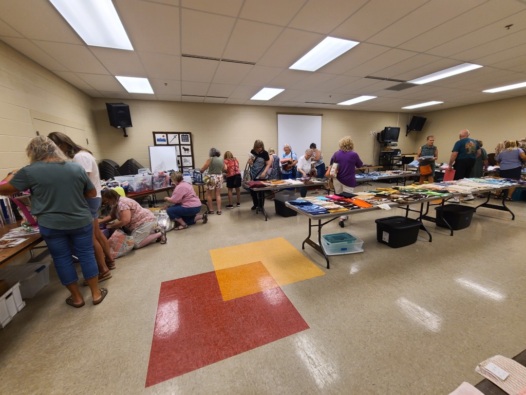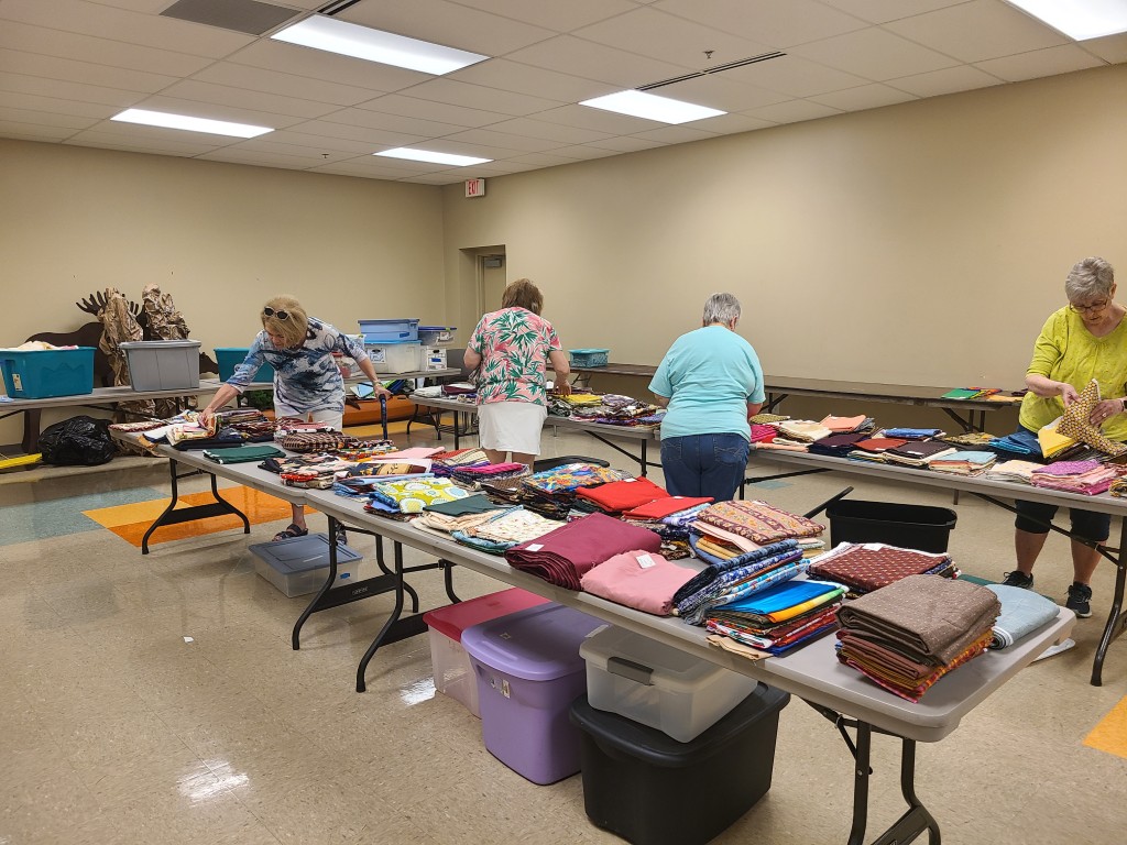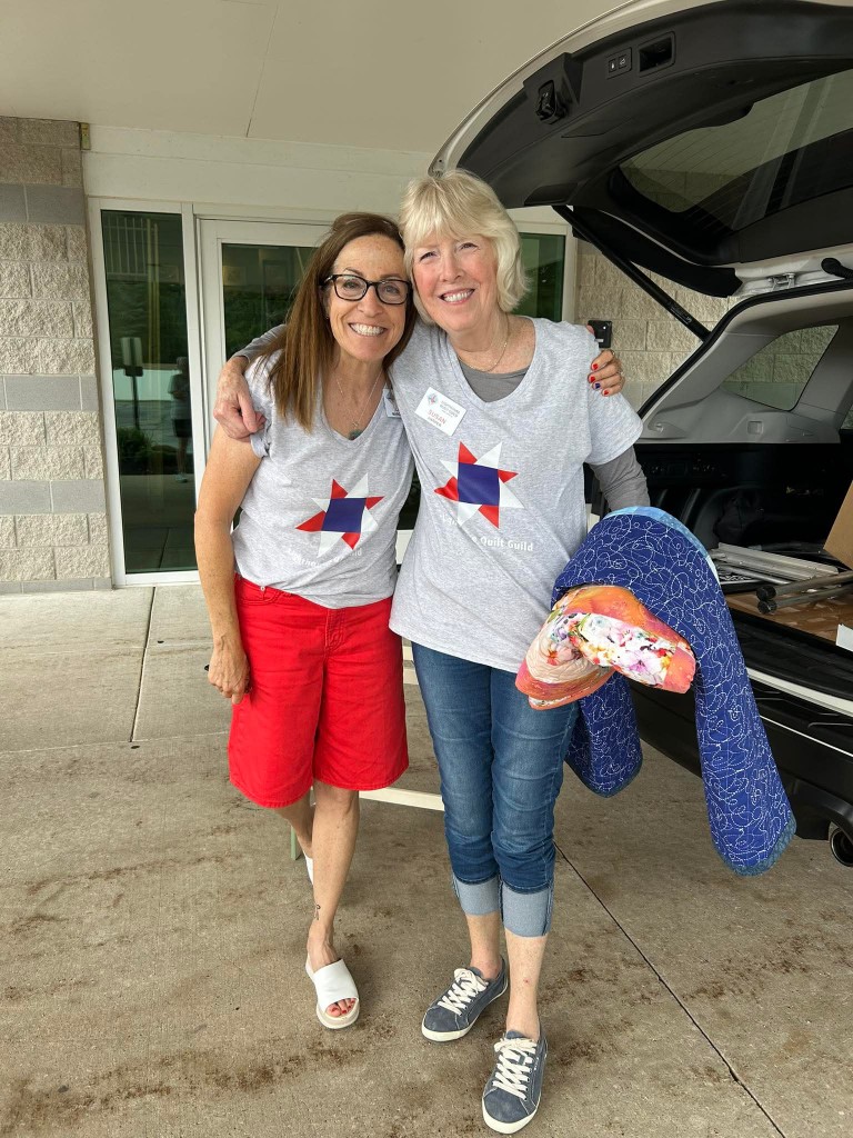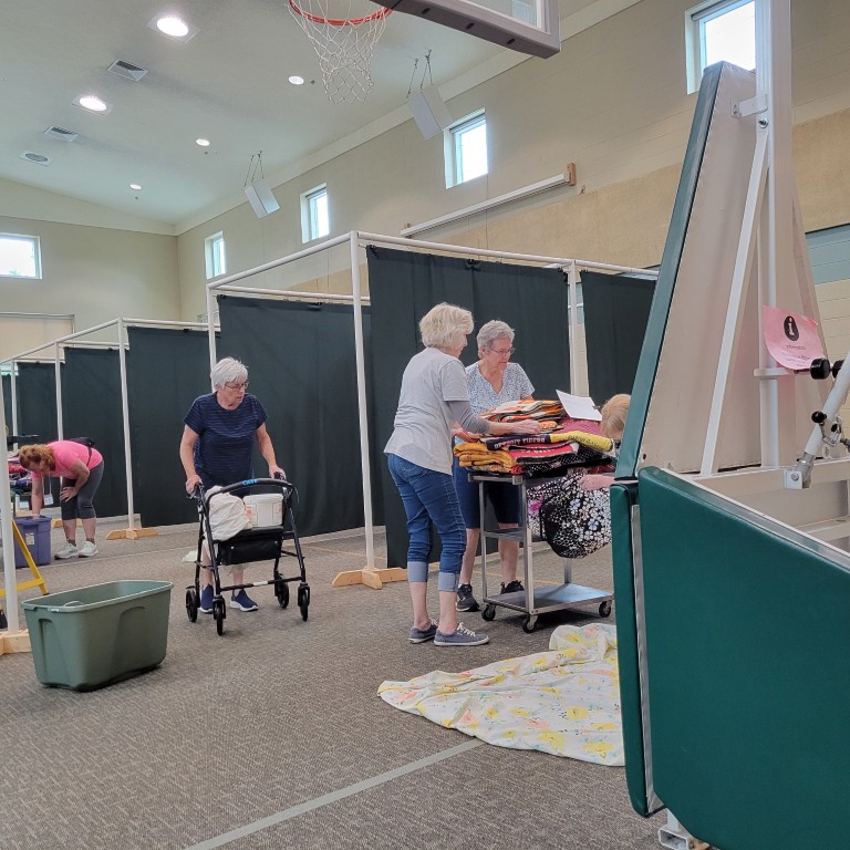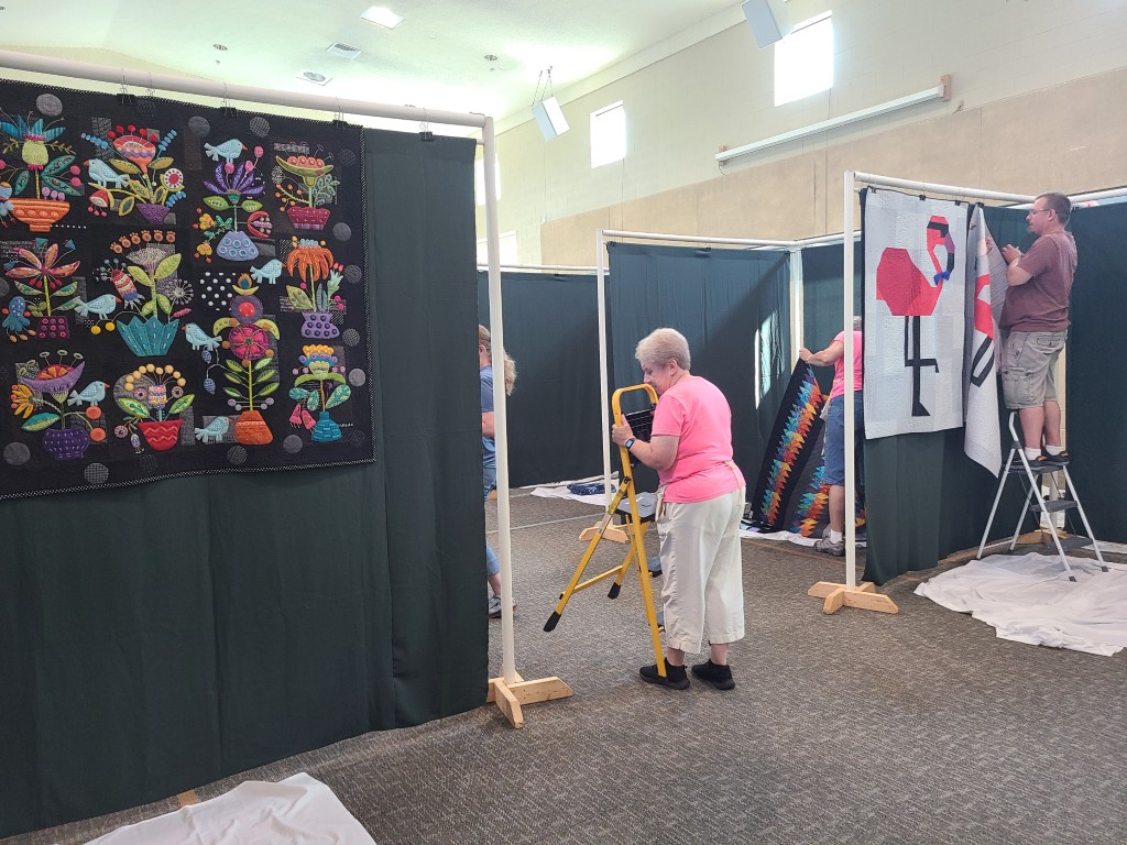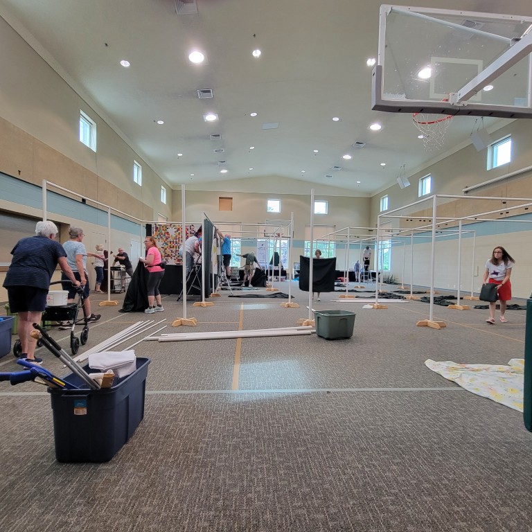 The Quilt Show begins with Elizabeth and Barb talking to Todd at Fox 17 News. If you would like to listen https://www.fox17online.com/morning-mix/lighthouse-quilt-guilds-annual-quilt-show-returns-to-grand-haven . The ladies did a great job promoting our guild and our show. Tuesday night we bring all the racks from storage to the church. Set up begins Wednesday when we set up the racks, the scrims and then the quilts. Thursday morning is fun when the Coast Guard comes to cut the ribbon to begin this 3 day event this year.