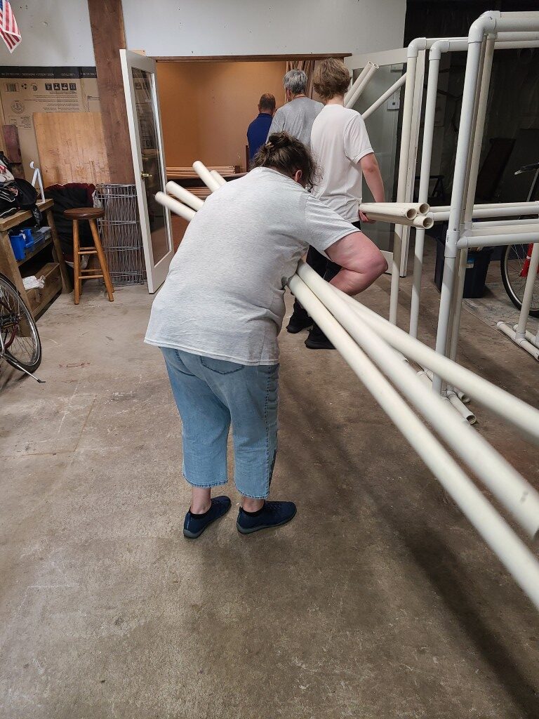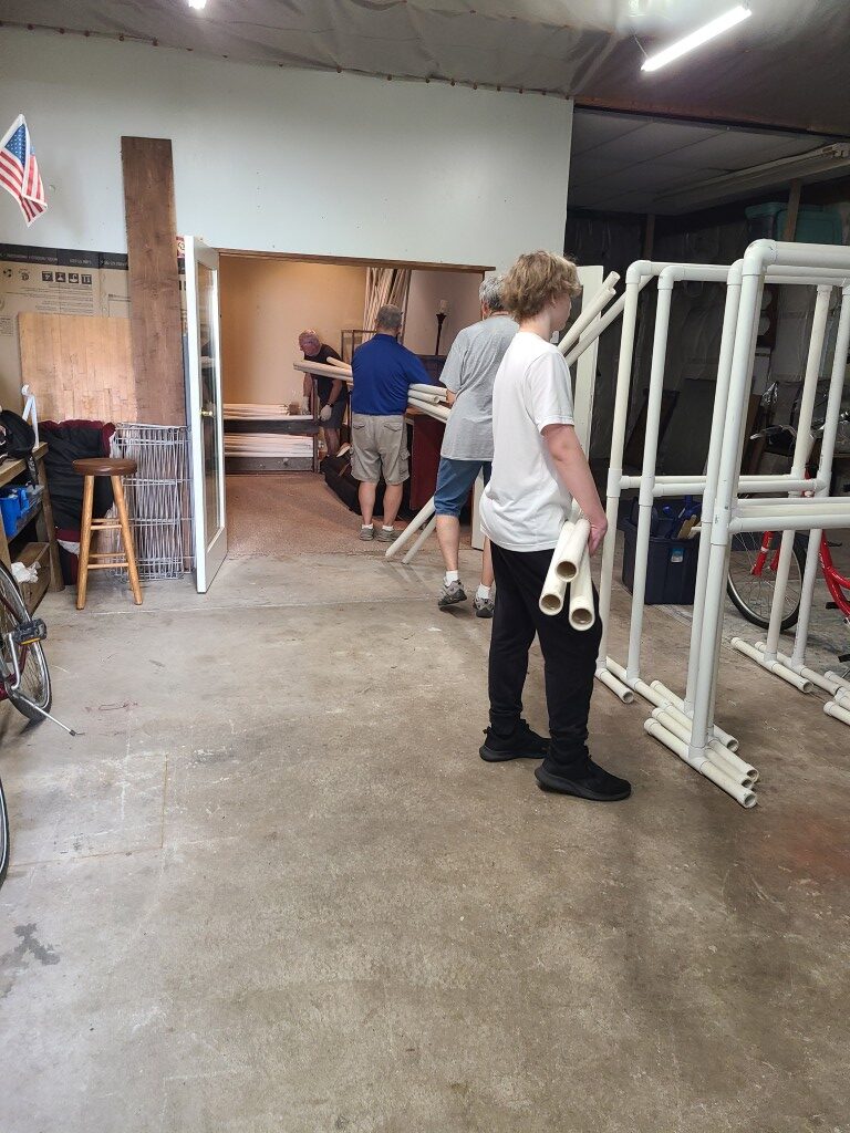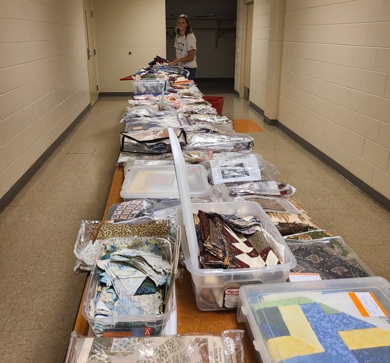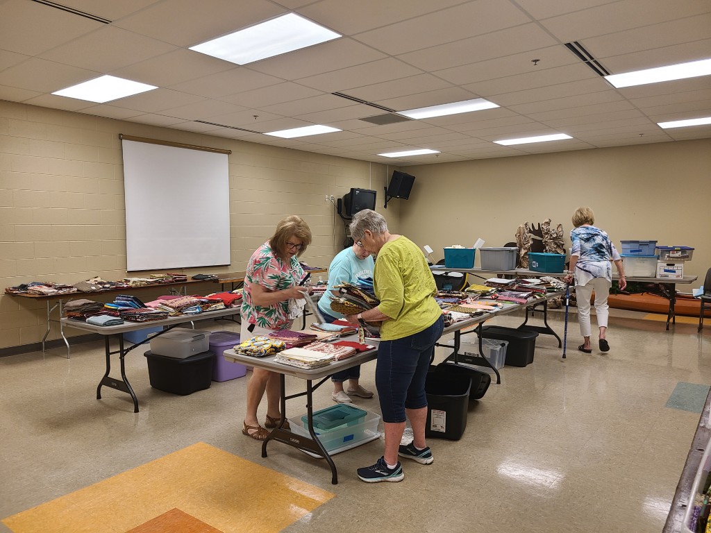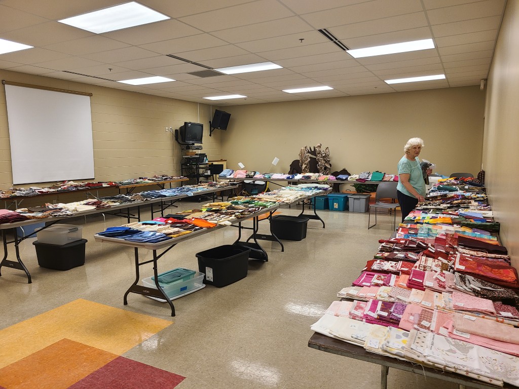 The Quilt Show begins with Elizabeth and Barb talking to Todd at Fox 17 News. If you would like to listen https://www.fox17online.com/morning-mix/lighthouse-quilt-guilds-annual-quilt-show-returns-to-grand-haven . The ladies did a great job promoting our guild and our show. Tuesday night we bring all the racks from storage to the church. Set up begins Wednesday when we set up the racks, the scrims and then the quilts. Thursday morning is fun when the Coast Guard comes to cut the ribbon to begin this 3 day event this year.