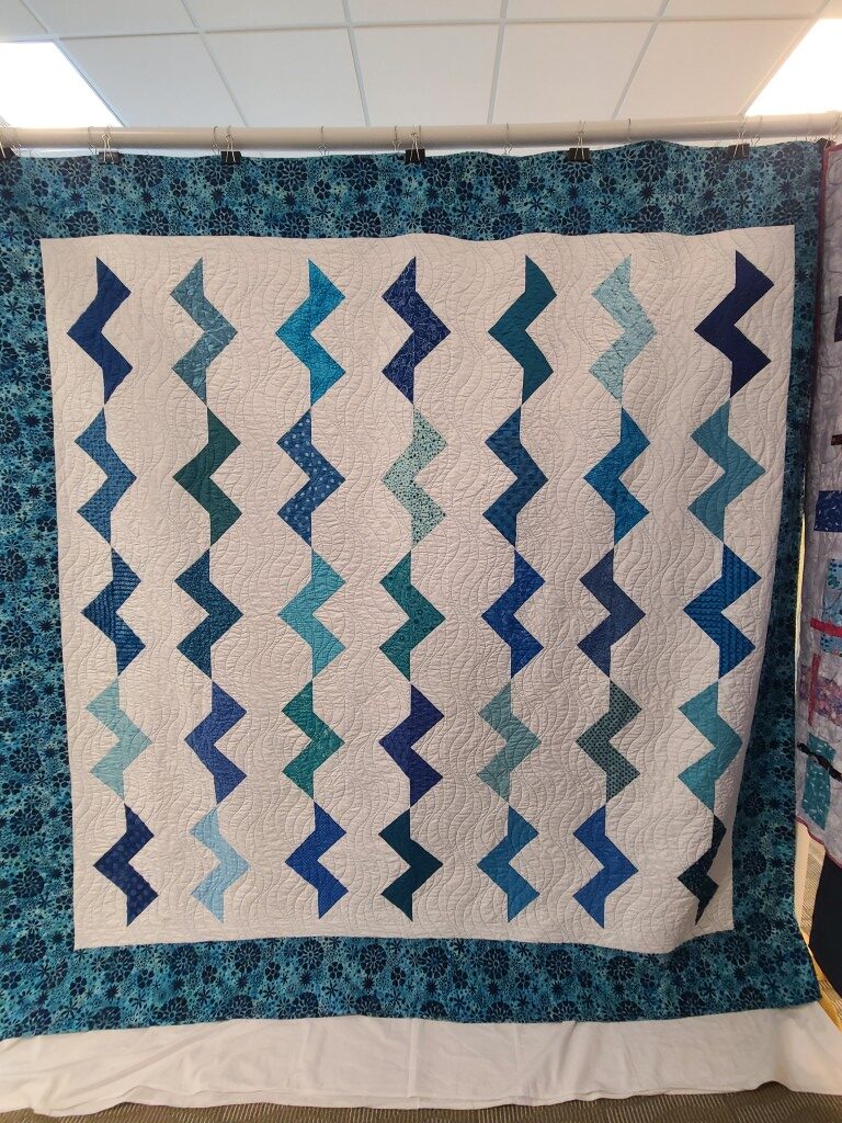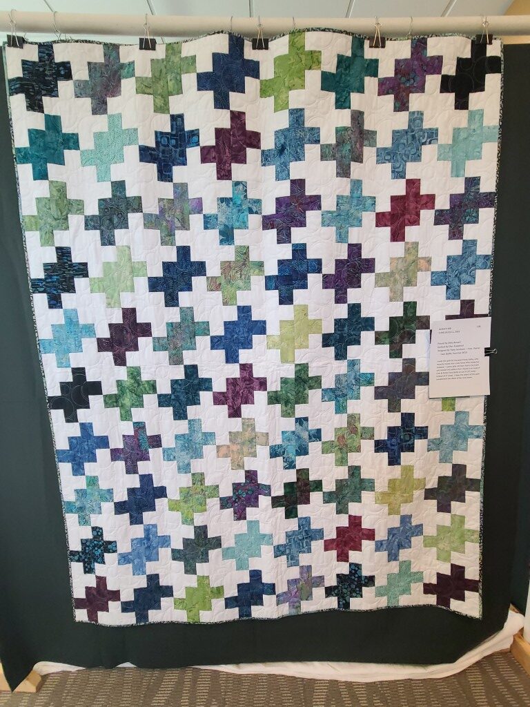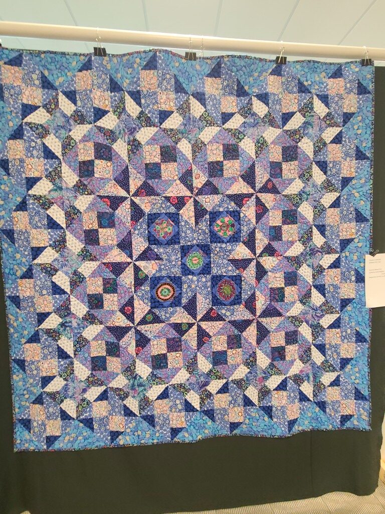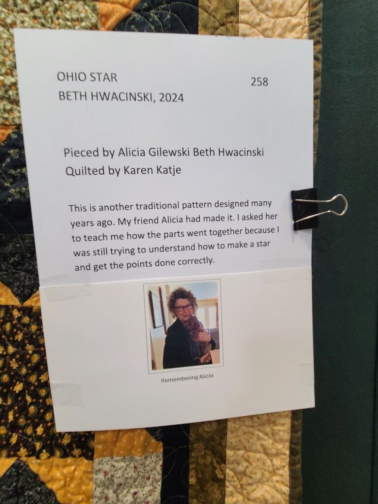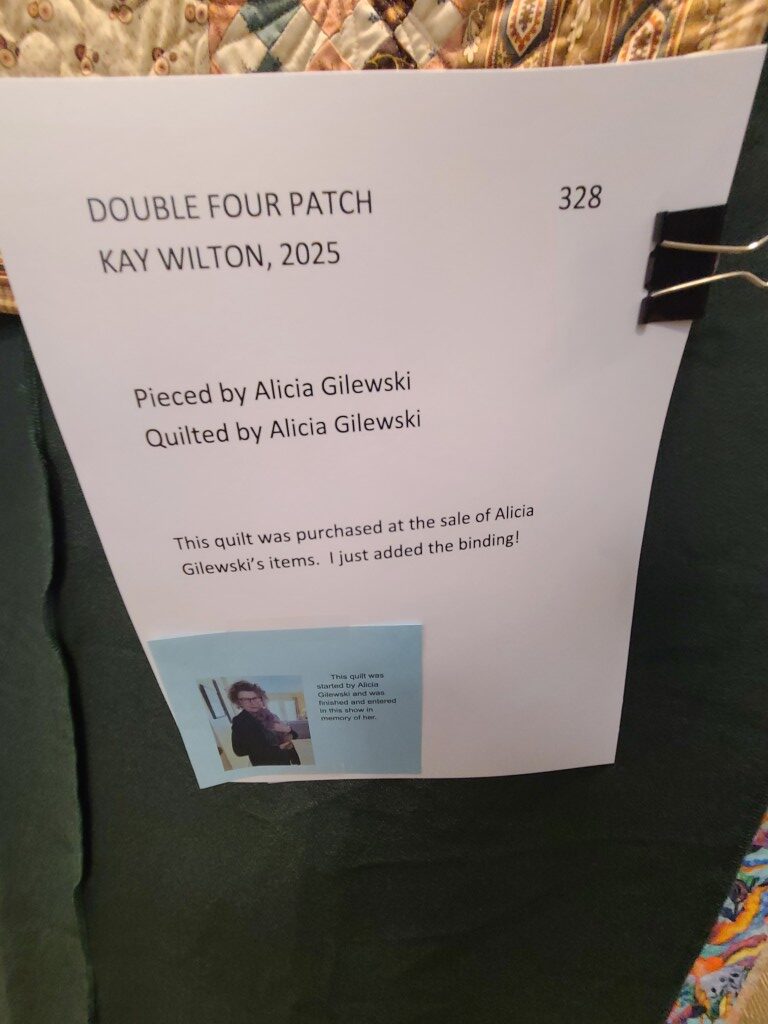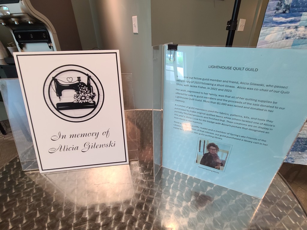 We honored our fellow guild member and friend, Alicia Gilewski, who passed away in July of 2023 following a short illness. Alicia was co-chair of our Quilt Show, with Jackie Fisher, in 2022 and 2023. Her wish, expressed to her family, was that all of her quilting supplies be offered for sale to guild members and the proceeds of the sale donated to our Lighthouse Quilt Guild. A number of guild members used the fabrics, patterns, kits, tools they purchased to make original quilted items while others tackled one of Alicia’s partially finished project and finished that. Their creations (11 in total) were on display in this year’s show.