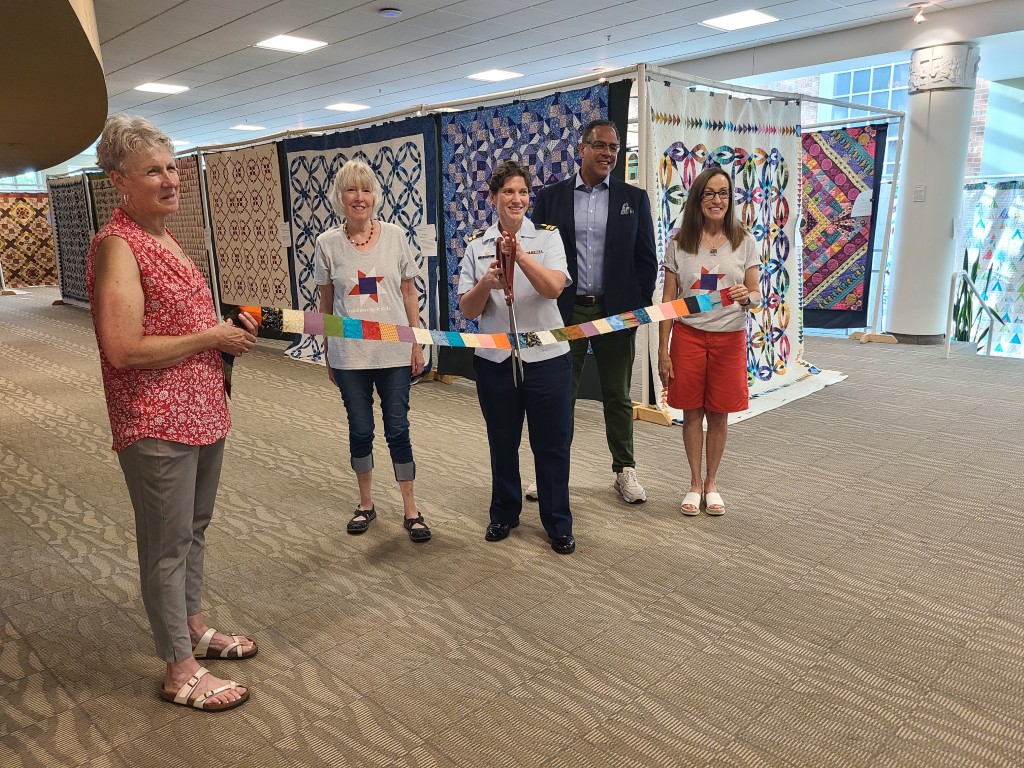 From left, Coast Guard Festival Executive Director Tracy Riley, Lighthouse Quilt Guild co-chair Susan Harper, U.S. Coast Guard Lt. Lisa Pietruszka, Second Christian Reformed Church pastor Tim Blackmon and Lighthouse Quilt Guild co-chair Laura Marcus-Nolan cut the ceremonial ribbon to officially kick off the 101st Coast Guard Festival at the guild’s annual quilt show.