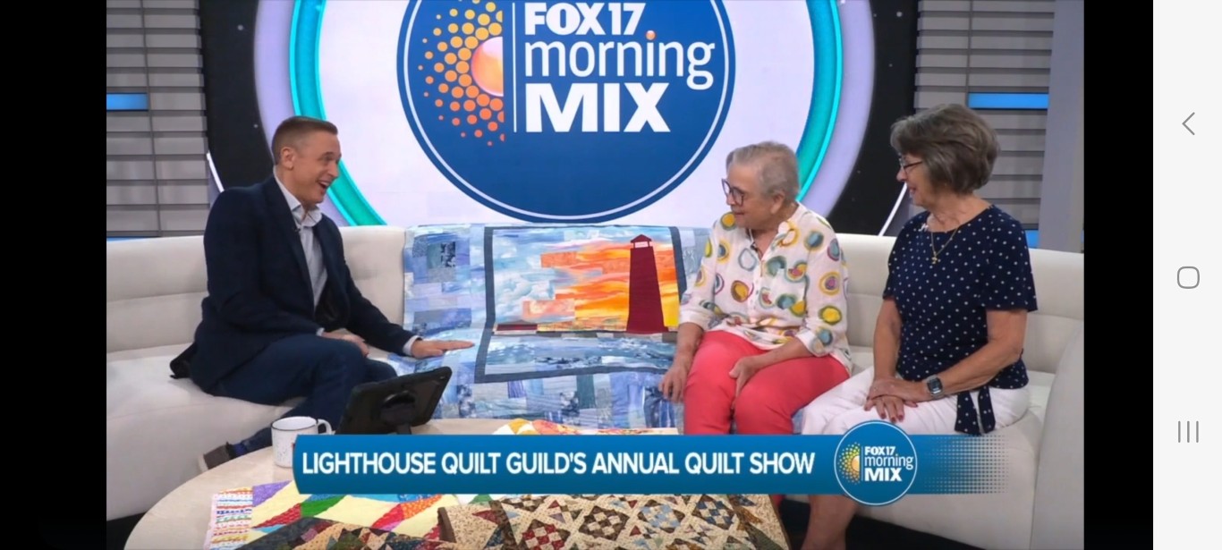 The Quilt Show begins with Elizabeth and Barb talking to Todd at Fox 17 News. If you would like to listen https://www.fox17online.com/morning-mix/lighthouse-quilt-guilds-annual-quilt-show-returns-to-grand-haven . The ladies did a great job promoting our guild and our show. Tuesday night we bring all the racks from storage to the church. Set up begins Wednesday when we set up the racks, the scrims and then the quilts. Thursday morning is fun when the Coast Guard comes to cut the ribbon to begin this 3 day event this year.